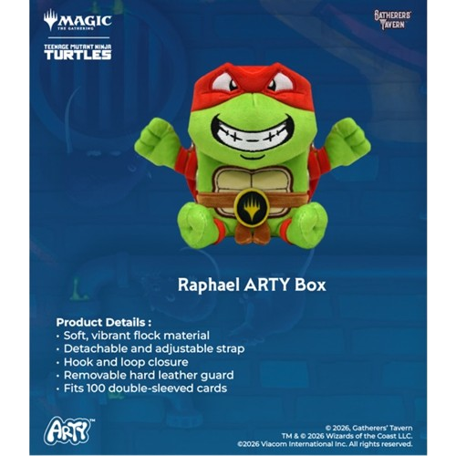 Dizajn s motivom Raphaela, najratobornijeg i najodlučnijeg člana Ninja Kornjača, odražava snagu, fokus i agresivan stil — osobine koje savršeno odgovaraju kompetitivnim MTG igračima. Upečatljiva ilustracija i dominantne boje čine ovaj ARTY Box istaknutim dodatkom svakom Magic setupu. Proizvod pripada ekskluzivnoj Gatherers’ Tavern liniji, poznatoj po kvalitetnim TCG dodacima i licenciranim dizajnima visoke estetske vrijednosti.